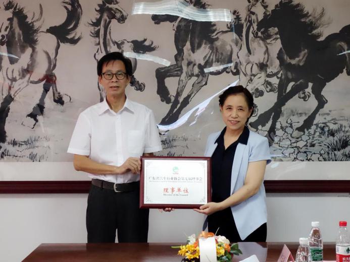 罗忠宁向学校授予“广东省汽车行业协会理事单位”牌匾(程伟凯摄)