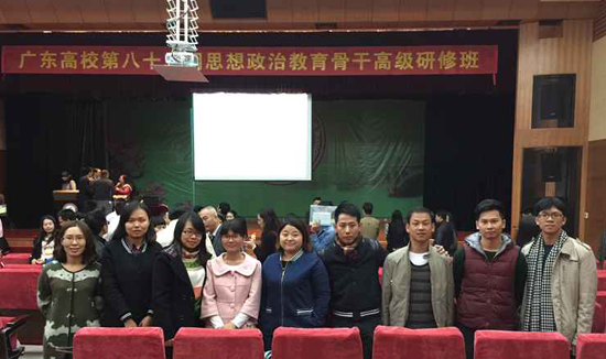 本网讯 12月1日至5日,广东高校第82期思想政治教育骨干高级研修班在广州省干部疗养院开班,我校派出黄忠瑶、王磊、李智、方丹、姚淑姬、李齐政、刘建斌、陈磊磊、陈勇等9名学生工作一线教师参加了培训。