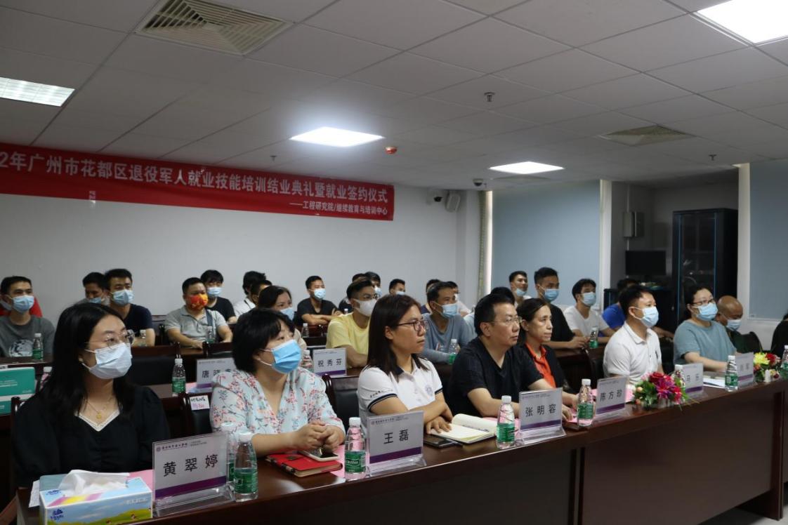本网讯(记者 祝秀芬)6月23日下午,2022年花都区退役军人就业技能培训结业典礼暨就业签约仪式在我校工程研究院举行。花都区退役军人事务局党组书记、局长刘军,安置科科长王月红等,广州荣华网联科技有限公司人事经理黄翠婷,我校工程研究院院长马乐、副院长陈方珍及工程研究院/继续教育与培训中心相关老师等一同出席本次结业仪式。