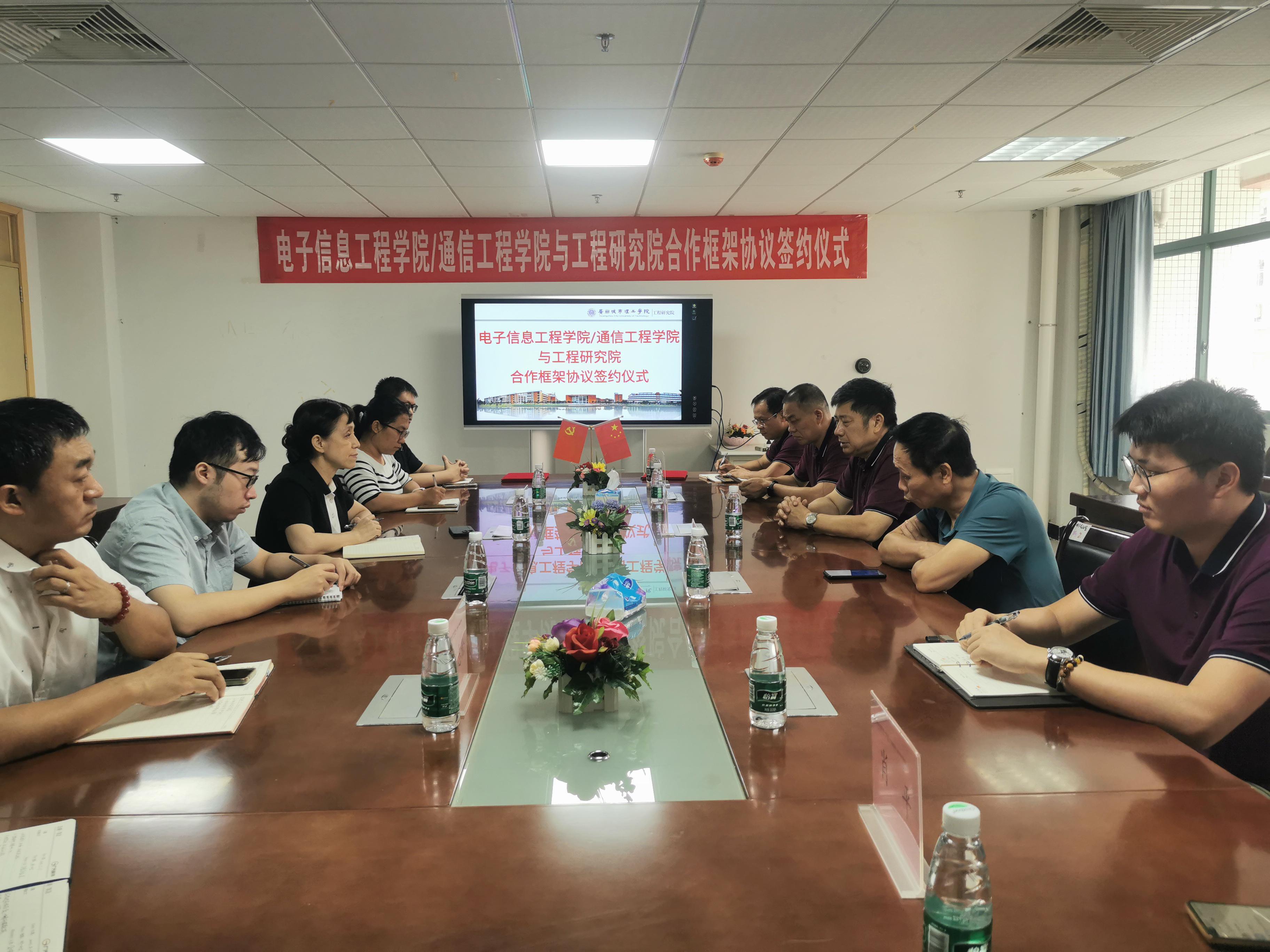 本网讯(记者 王磊)为进一步促进科研合作、推动教学与科研一体化发展,9月12日上午,电子信息工程学院/通信工程学院院长何志伟、副院长曹英烈带队,赴工程研究院参加合作框架协议签约仪式。工程研究院院长马乐及相关老师出席仪式。