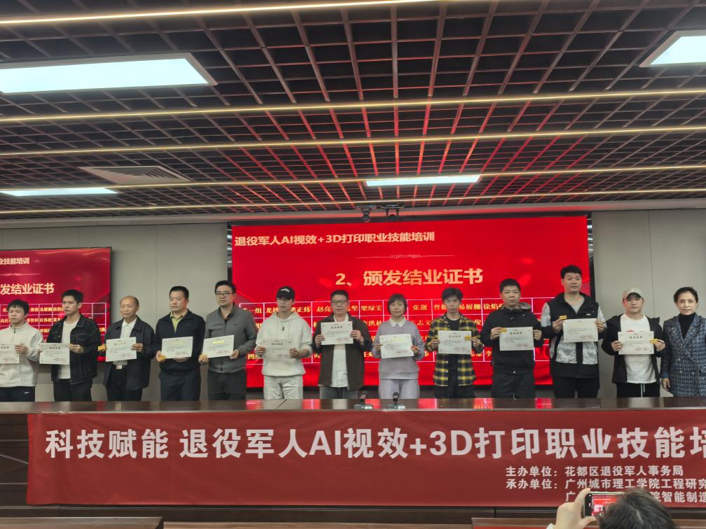 本网讯(记者 王磊)为深入落实国家退役军人就业创业扶持政策,破解退役军人转型期技能短板难题,12月5日至7日,广州城市理工学院工程研究院与花都区退役军人事务局联合举办“AI视效+3D打印职业技能培训班”,为59名退役军人学员提供前沿性的技能赋能。此次培训是一次校地协同服务退役军人提高技能高质量就业的有益实践。学校党委书记杜小明、花都区退役军人事务局党组书记、局长周扁、学校工程研究院院长马乐、广州哈里模创科技公司经理李忠华、中睿星弘有限公司总经理马宇灏及相关领导、企业代表出席开班典礼。